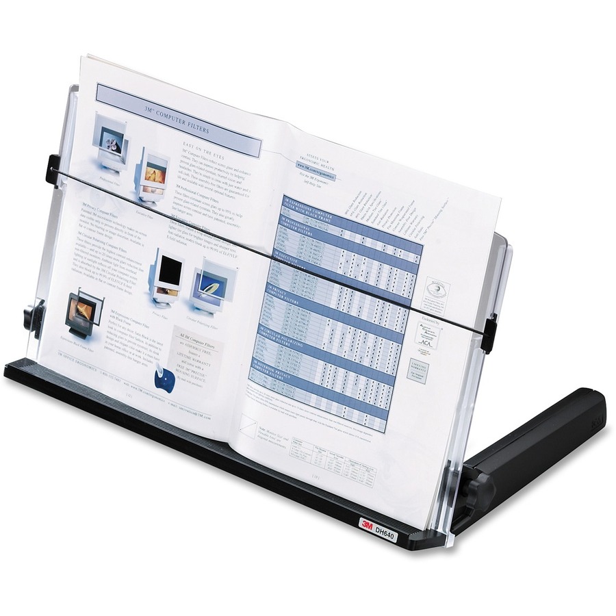 Document holder keeps documents between the monitor and keyboard to help reduce head, neck and eye movement. Design offers a versatile angle and height adjustment for easy viewing. 18" wide, transparent backplate supports wide and heavy documents. Elastic line-guide enables easy data entry and helps keep up to 300 sheets in place. Document holder includes a skid-free base.