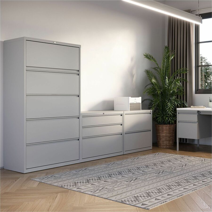 36" wide lateral file features five drawers with hanging file rails for side-to-side filing in letter-size, legal-size or A4-size for versatility. Each drawer has a magnetic label holder for easy identification where you need it. Design also features a core-removable lock for security, dual locking bars, full-width pull, ball-bearing slide suspension for smooth opening and closing, reinforced base, and four adjustable leveling guides for stabilization. Interlock system prohibits the extension of more than one drawer at a time for your safety. Counterweight prevents tipping. Lateral file meets or exceeds applicable ANSI/BIFMA standards.