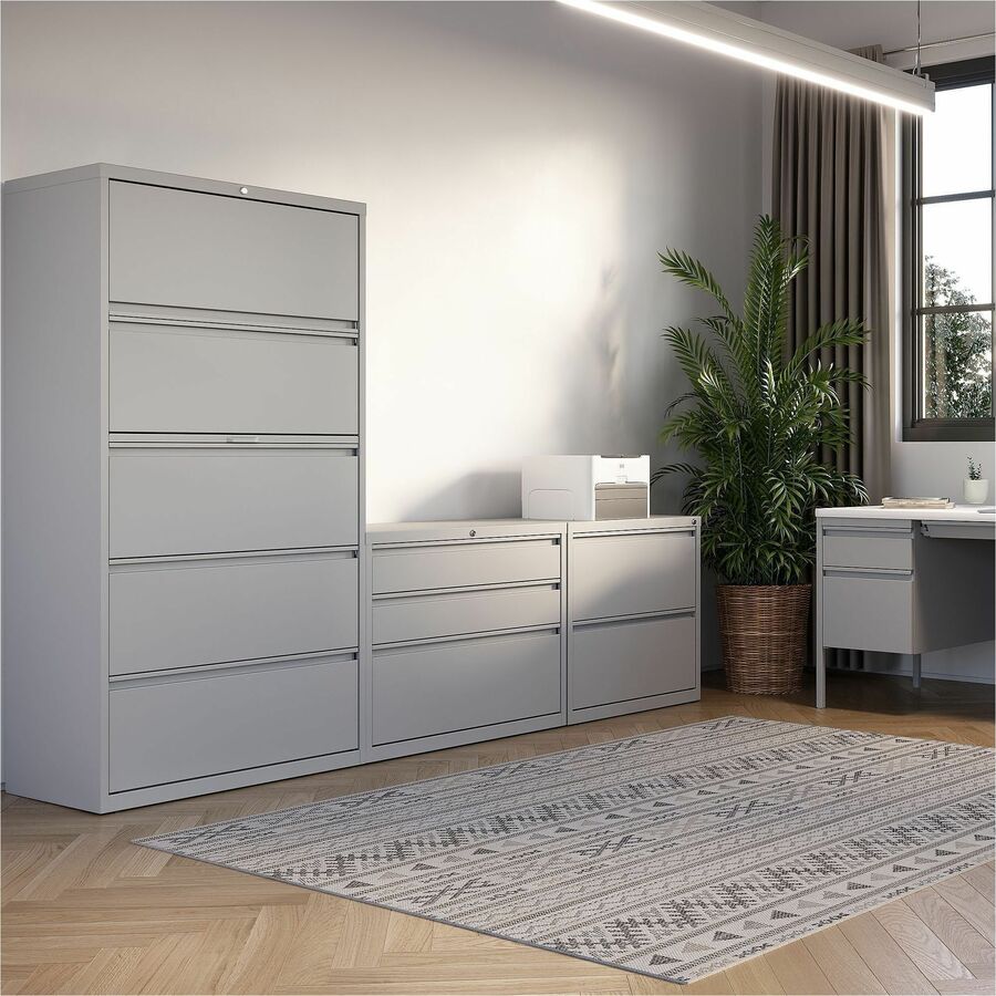 42" wide lateral file features five drawers with hanging file rails for side-to-side filing in letter-size, legal-size or A4-size for versatility. Each drawer has a magnetic label holder for easy identification where you need it. Design also features a core-removable lock for security, dual locking bars, full-width pull, ball-bearing slide suspension for smooth opening and closing, reinforced base and four adjustable leveling guides for stabilization. Interlock system prohibits the extension of more than one drawer at a time for your safety. Counterweight prevents tipping. Lateral file meets or exceeds applicable ANSI/BIFMA standards.