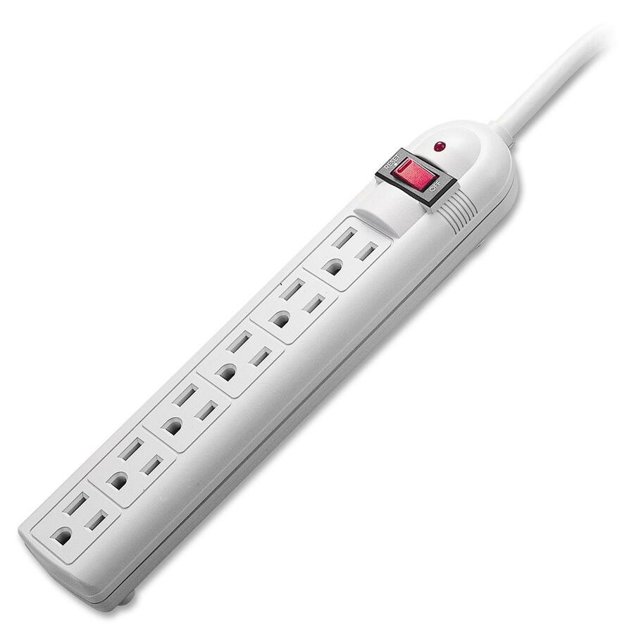 Six-outlet surge protector protects against surges, spikes and electrical noises. Illuminated switch controls all outlets. Surge protector offers 6000 maximum spike voltage and 500 maximum clamping voltage. Clamping response time is less than one nanosecond. Noise attenuation 4-52dB.