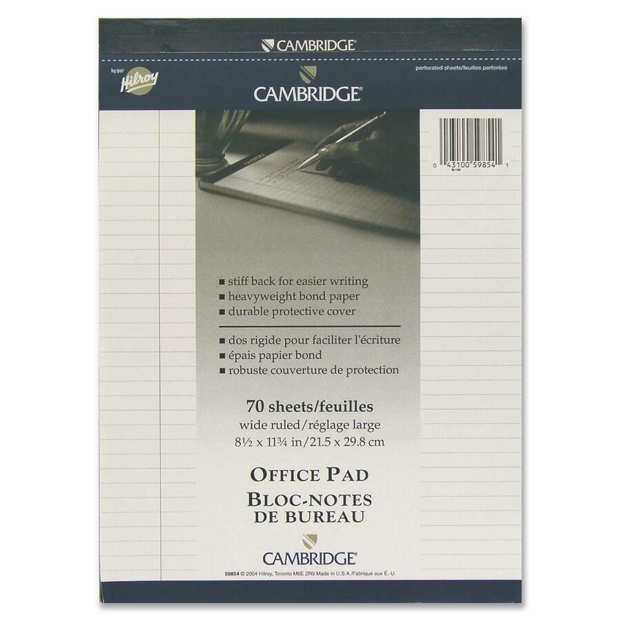 Office pads feature tear-off top sheets and durable permanent covers. Made from ruled 20 lb. special smooth finish paper with microperforations for clean tear out. Office pads include single margins and extra-thick stiff backs that provide a sturdy writing surface.