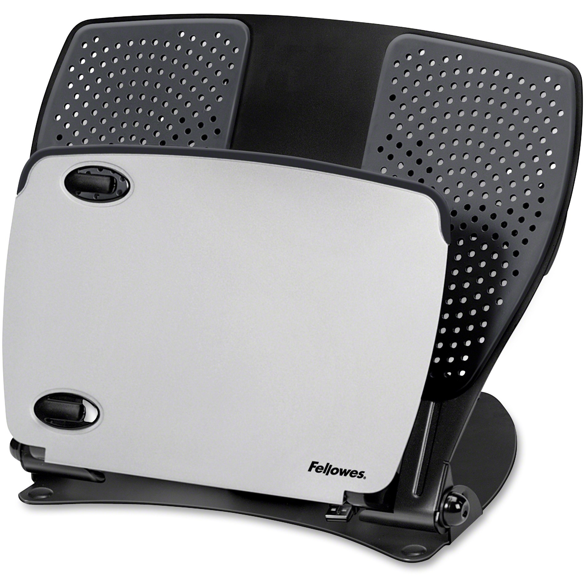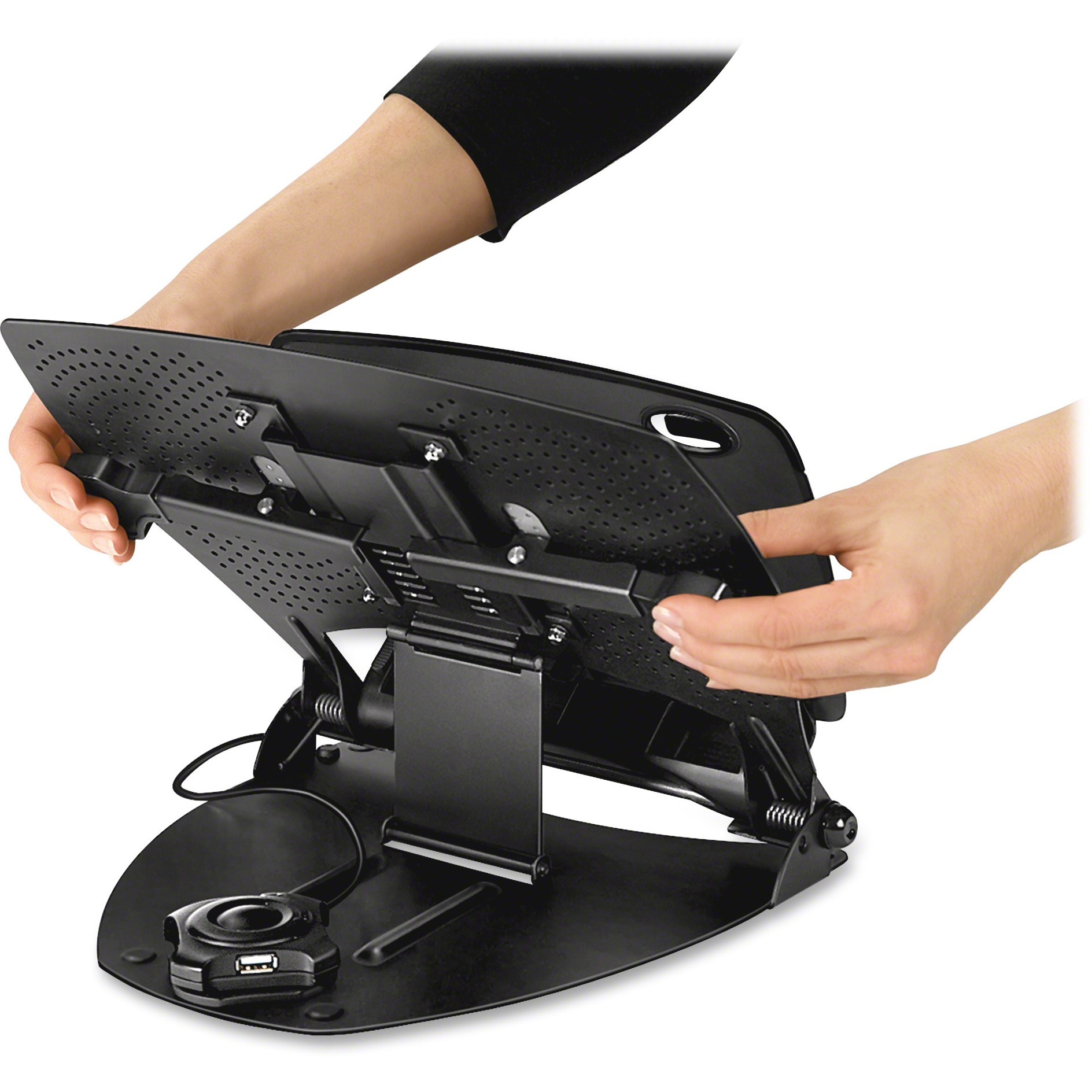 This ergonomically designed workstation Adjustable height with up to 9 positions. Sturdy metal frame with padding and rubber strip firmly supports and protects laptop. Features 4 USB ports for plug and play convenience. Adjusts easily and folds flat. Inline document holder offers vertical or horizontal page orientation. Supports 17" laptops upto 15 lbs.