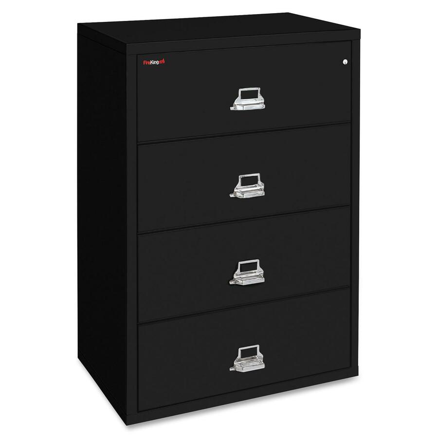 Insulated lateral record file cabinet offers a UL Class 350 one-hour fire and impact rating. Features parchment powder-coat finish, oven-dried, asbestos-free gypsum insulation and full-suspension file drawers. Full height drawers accommodate letter/legal hanging folders or regular file folders.