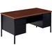 Double-pedestal desk is part of the Lorell Fortress Series, a practical and professional desk solution ideal for business, government and educational offices. Durable, high-performance steel construction stands up to rigorous daily use. The 1-1/8" thick top with square edges features a Mahogany laminate surface that is scratch-resistant, stain-resistant and water-resistant. Design also features a 3/4-height modesty panel and box/file pedestal on both sides. Drawers lock and offer full-extension, ball-bearing slides and full-width, integrated drawer pulls. File drawers accommodate letter-size files. Central-locking center drawer features a core-removable lock. Two grommets offer easy cord management. Reinforced, double-frame inner structure keeps desk solid and sturdy for years of use. Steel desk in a charcoal color meets or exceeds ANSI/BIFMA standards.
