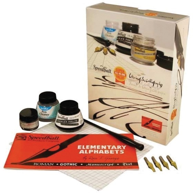 This all-in-one kit includes all the essentials to get started in drawing, lettering or calligraphy. Great for beginners and students. Includes (1) each of the following: 2oz (59.1ml) Super Black India Ink and Pen Cleaner; .41oz (12ml) Super Pigmented Acrylic Drawing and Lettering Ink (Silver); C1, C2, B4, and A5 Pen Nibs; Speedball Pen Nib Holder; Speedball Elementary Alphabets Instruction Book; practice paper.