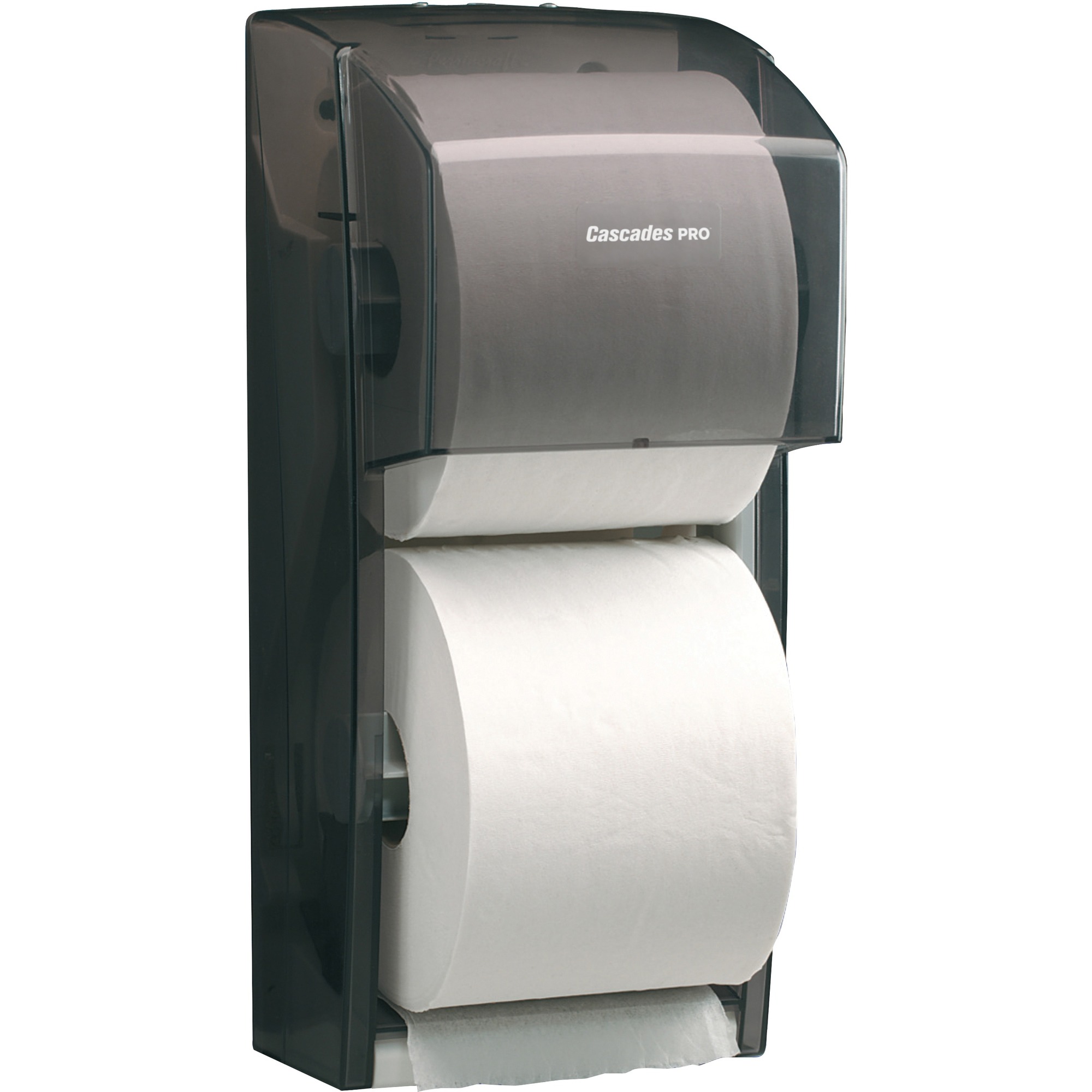 Perfect for any mid-size facility or office bathroom. Transparent cover always makes it clear to see when it's time to refill. Locking cover to eliminate stub roll waste by using the rolls sequentially. 6-5/8"W x 6"D x 13-5/8"H. Black.