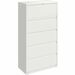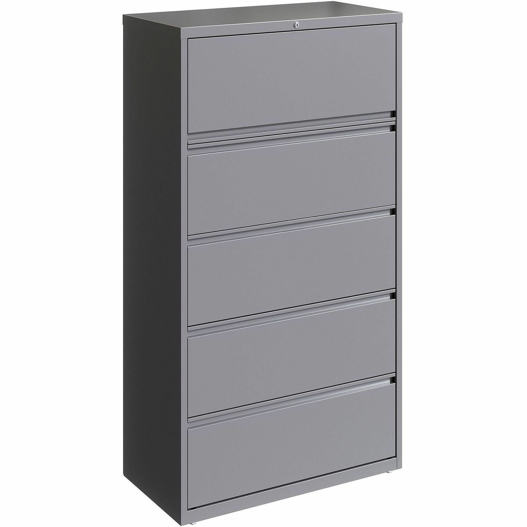 36" wide lateral file features five drawers with hanging file rails for side-to-side filing in letter-size, legal-size or A4-size for versatility. Each drawer has a magnetic label holder for easy identification where you need it. Design also features a core-removable lock for security, dual locking bars, full-width pull, ball-bearing slide suspension for smooth opening and closing, reinforced base, and four adjustable leveling guides for stabilization. Interlock system prohibits the extension of more than one drawer at a time for your safety. Counterweight prevents tipping. Lateral file meets or exceeds applicable ANSI/BIFMA standards.