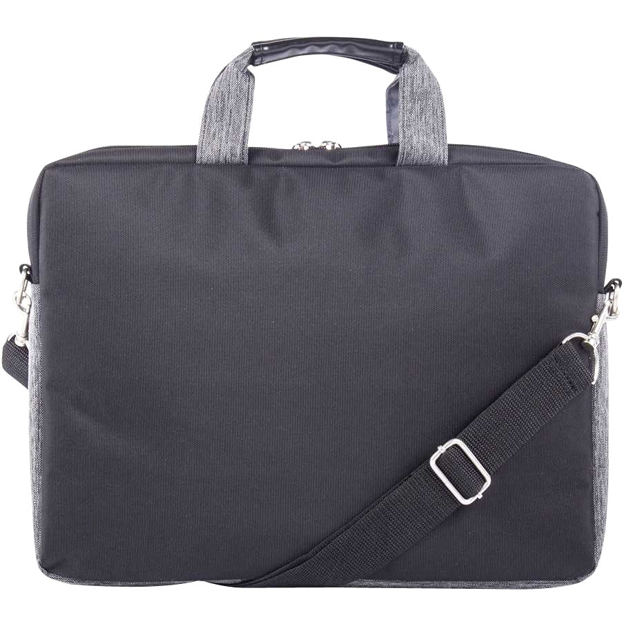 2-tone polyester. Padded compartment for laptop up to 15.6". One front zippered pocket. Detachable shoulder strap. 15.5 x 1.75 x 11.5"H. Black and grey.