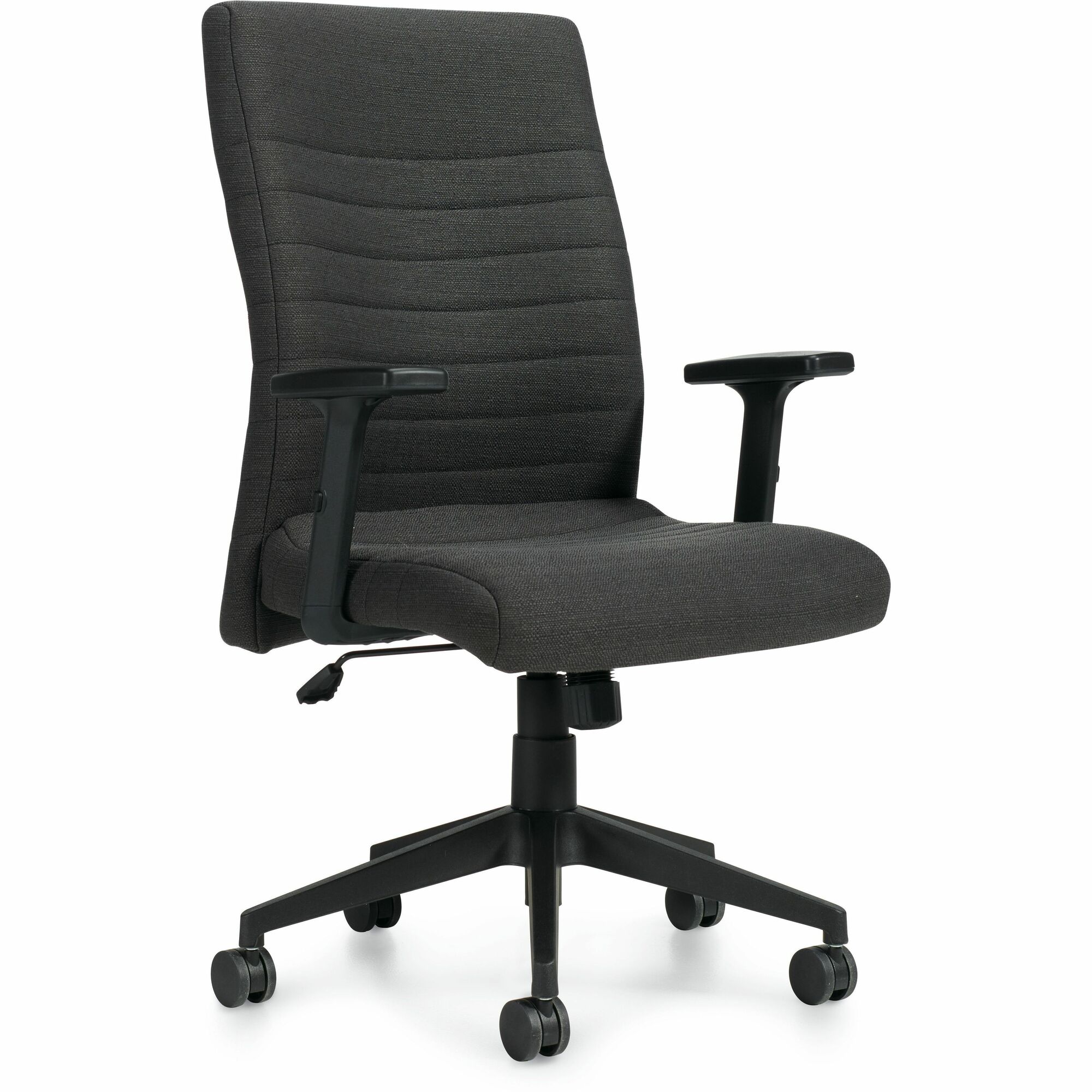 High back management tilter chair featuring center tilt with upright position tilt lock, tilt tension adjustment and pneumatic seat height adjustment. Contoured seat shape and waterfall edge with S-curve back shape for support of lumbar, shoulder and head. Height adjustable T-arms with soft urethane armcaps and dual wheel carpet casters. Rated for users up to 300 lb. (based on an 8-hour day, 40-hour week). Tested to meet or exceed ANSI / BIFMA standards and is compliant with the emissions guidelines set by the GREENGUARD Environmental Institute. Upholstered in graphite fabric. Overall Dimensions: 25"W x 27.5"D x 43"H. Backed by Global's Limited Lifetime Warranty.