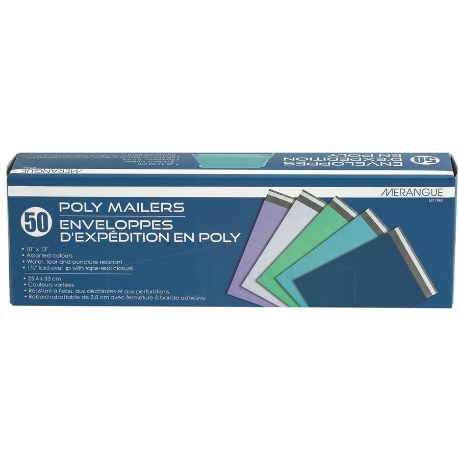 Water and puncture resistant Features 1-1/4" pullover lip with self-seal closure. Open end. 10" x 13". Assorted Colours. 50/pkg.