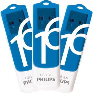 Fast and reliable medium for storing and sharing all your favourite files. 16 GB. Fast data transfer with Super Speed USB 3.0, reads files up to 100 MB/s, LED indicator, swivel protection mechanism. White/Blue. 3/pkg.