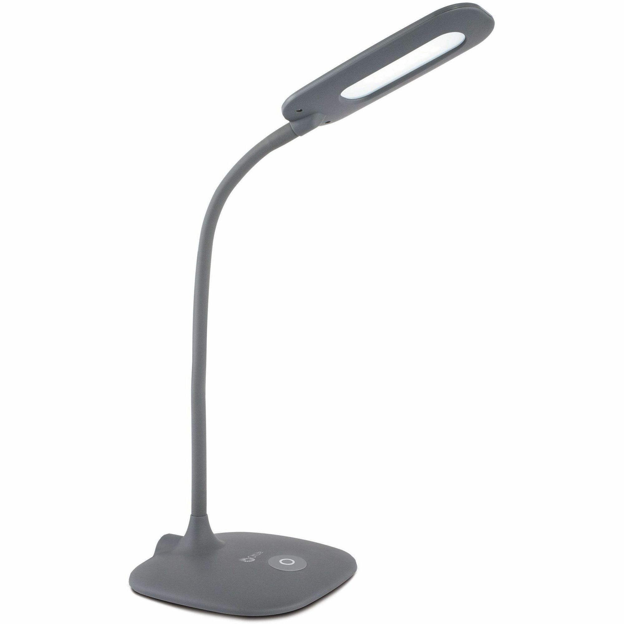 Soft touch finish perfect for office, crafting table or dorm room. With a 6-1/4" shade that extends over work area and a 13-1/2" flexible, rubberized neck, you can direct light wherever you need it most. Features touch activated 3 brightness settings, high contrast, OttLite ClearSun® LED with super bright natural daylight LEDs rated to last up to 40,000 hours. 12" high. 6-1/4" diameter. 460 lumens. 6.2W. Integrated LED. Grey.